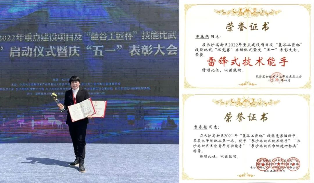 表彰大會上,湖南捷誠職工曹春艷被授予“雷鋒式技術能手”稱號。同時,被授予“長沙高新區技術能手”“長沙高新區杰出青年崗位能手”“長沙高新區巾幗建功標兵”等稱號。