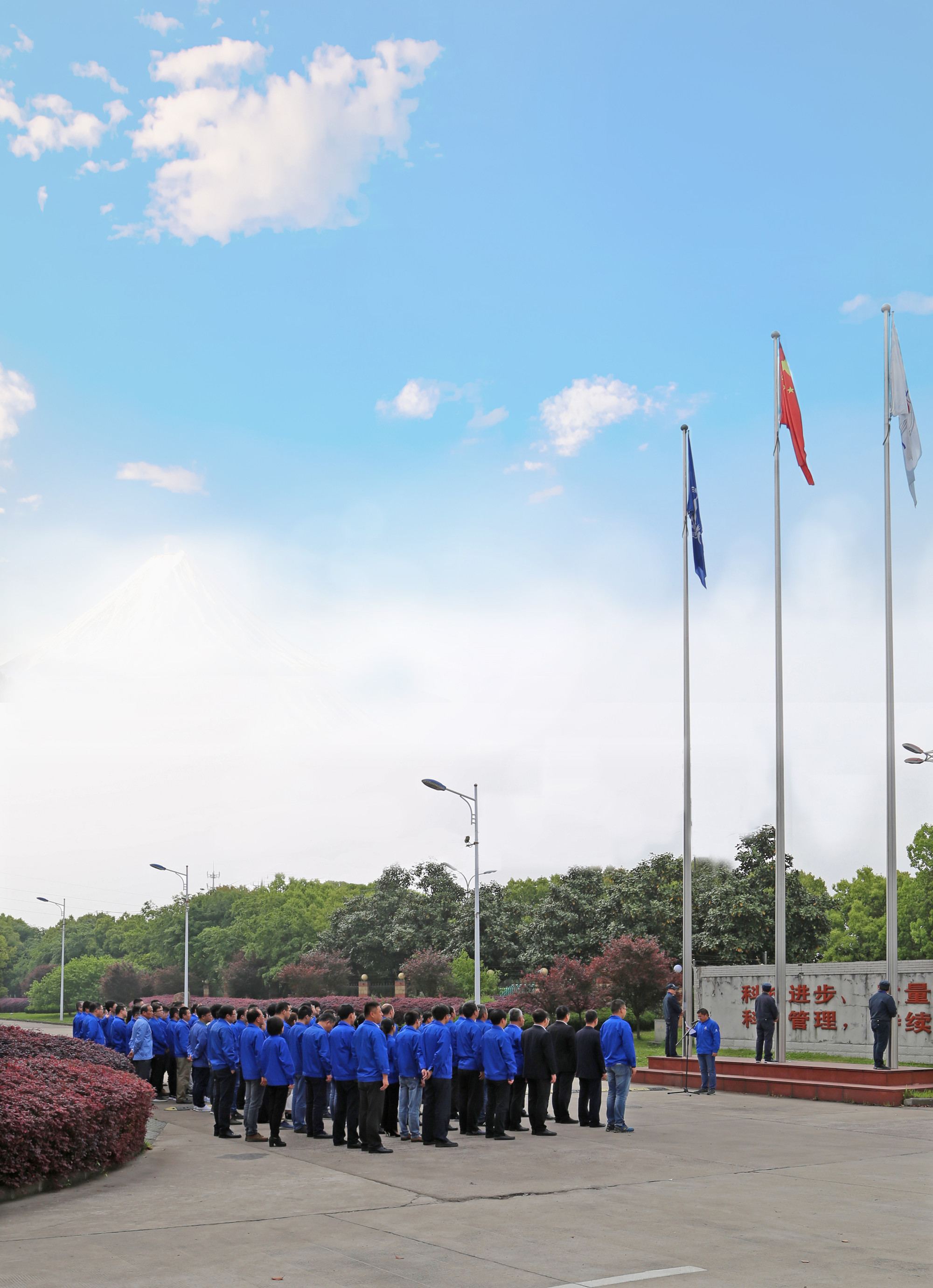 江蘇捷誠領(lǐng)導(dǎo)班子、各車間部室負責(zé)人、各黨支部書記、工會和團委代表、技術(shù)中心全體人員參加升旗儀式。當(dāng)雄壯有力的《義勇軍進行曲》響徹整個廠區(qū),全體人員行注目禮,全場彌漫著一種莊嚴肅穆的氣息,鮮艷的五星紅旗冉冉升起,激發(fā)了全體干部職工不斷向上的斗志,點燃了大家強烈的愛國熱情。升旗儀式上,公司黨委號召全廠職工把愛國之志轉(zhuǎn)化為報效祖國的實際行動,為航天事業(yè)發(fā)展而奮斗。