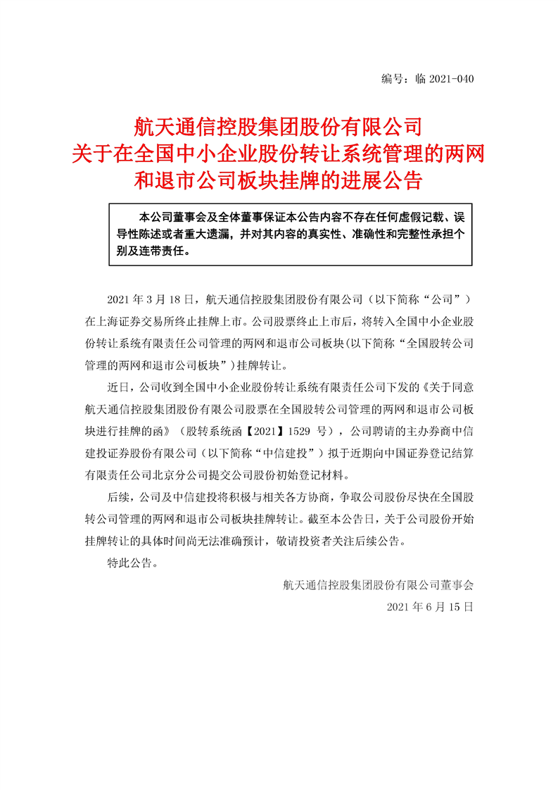 航天通信控股集團(tuán)股份有限公司關(guān)于在全國(guó)中小企業(yè)股份轉(zhuǎn)讓系統(tǒng)管理的兩網(wǎng)和退市公司板塊掛牌的進(jìn)展公告